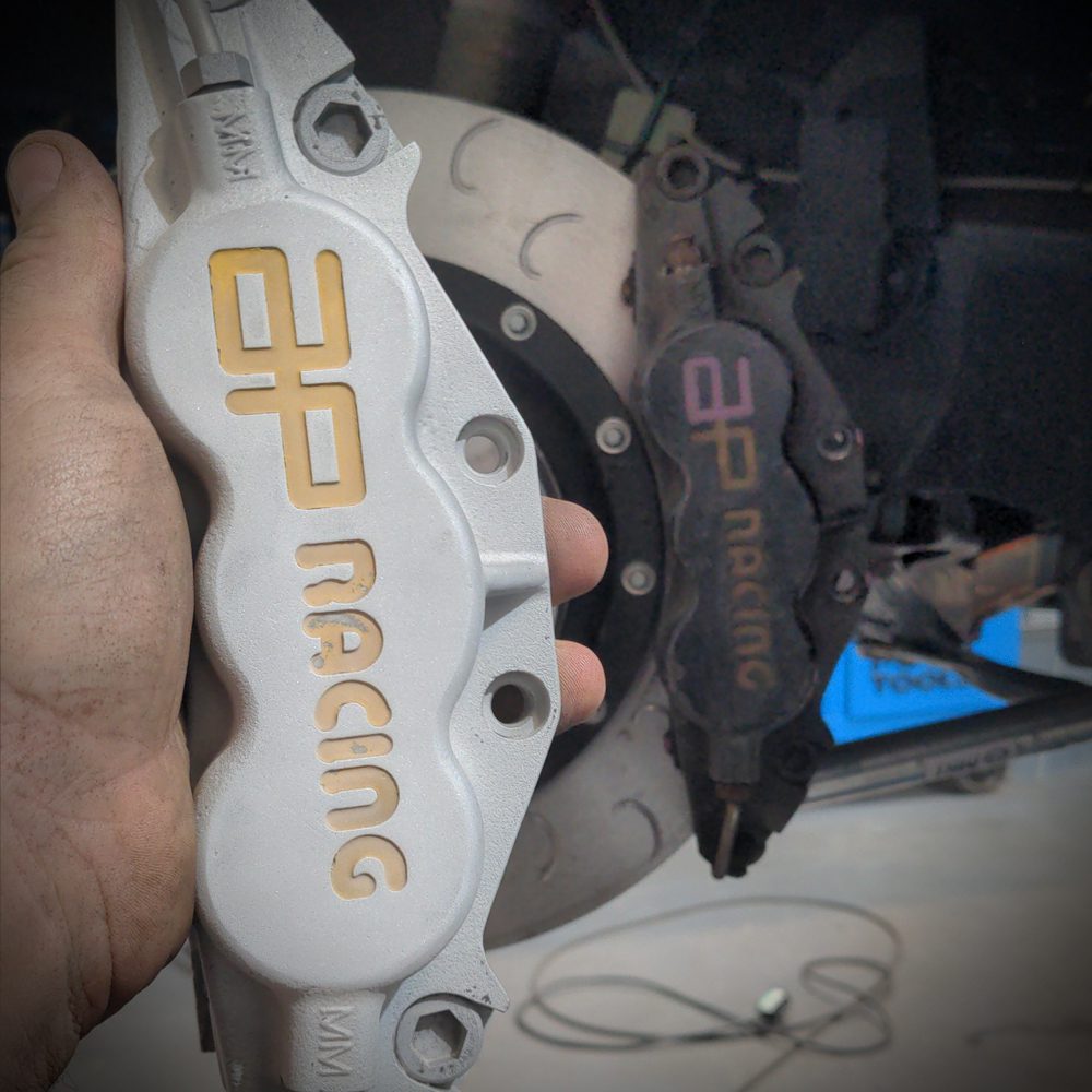 New front brakes β well, they had a bit of a rough start. One of the caliper bolts decided to play tricky and stripped the thread in the adaptor. But, no sweat! We handled it like seasoned pros, repaired the bracket, replaced the front rotors and pads, and thought we were good to go. The brakes were set for the track day at Oulton Park, or so we believed. Cue the dramatic twist! π₯ A puddle of brake fluid greeted us the next day β the calipers had an unexpected leak from a piston, one each side! Time for some emergency fixing and last-minute brake fittings. But alas, it was too late. The track day had to be cancelled, leaving us scratching our heads and our customer feeling less than thrilled.Β Cue strip, rebuild and refresh time!